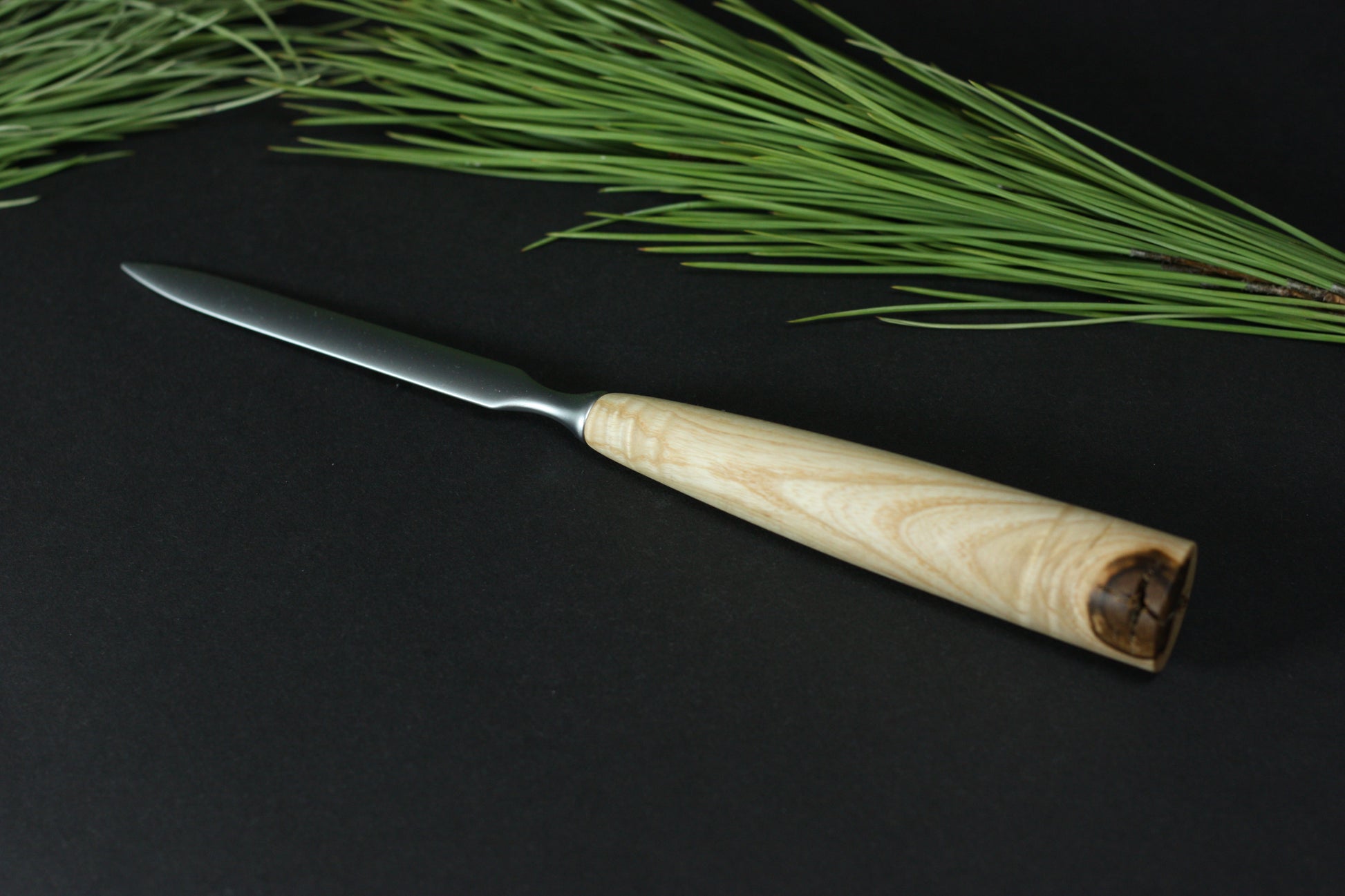Die edle, matt verchromte Klinge sorgt für eine saubere und präzise Schnittleistung und bildet einen eleganten Kontrast zum warmen Holzton. Die Oberfläche des Holzgriffs ist mit Hartöl endbehandelt, wodurch die natürliche Maserung des Eschenholzes besonders schön zur Geltung kommt und gleichzeitig ein dauerhafter Schutz gewährleistet wird.