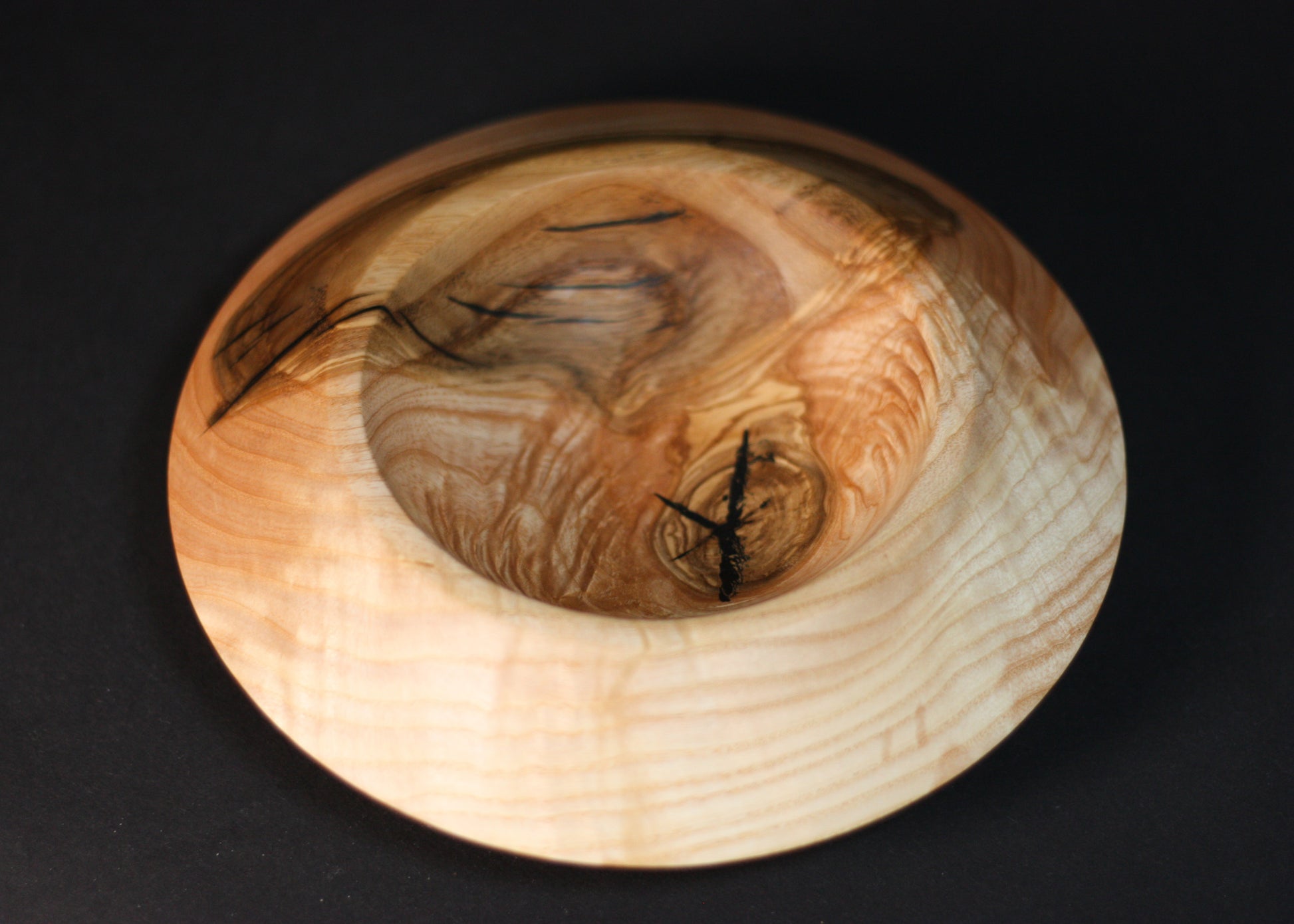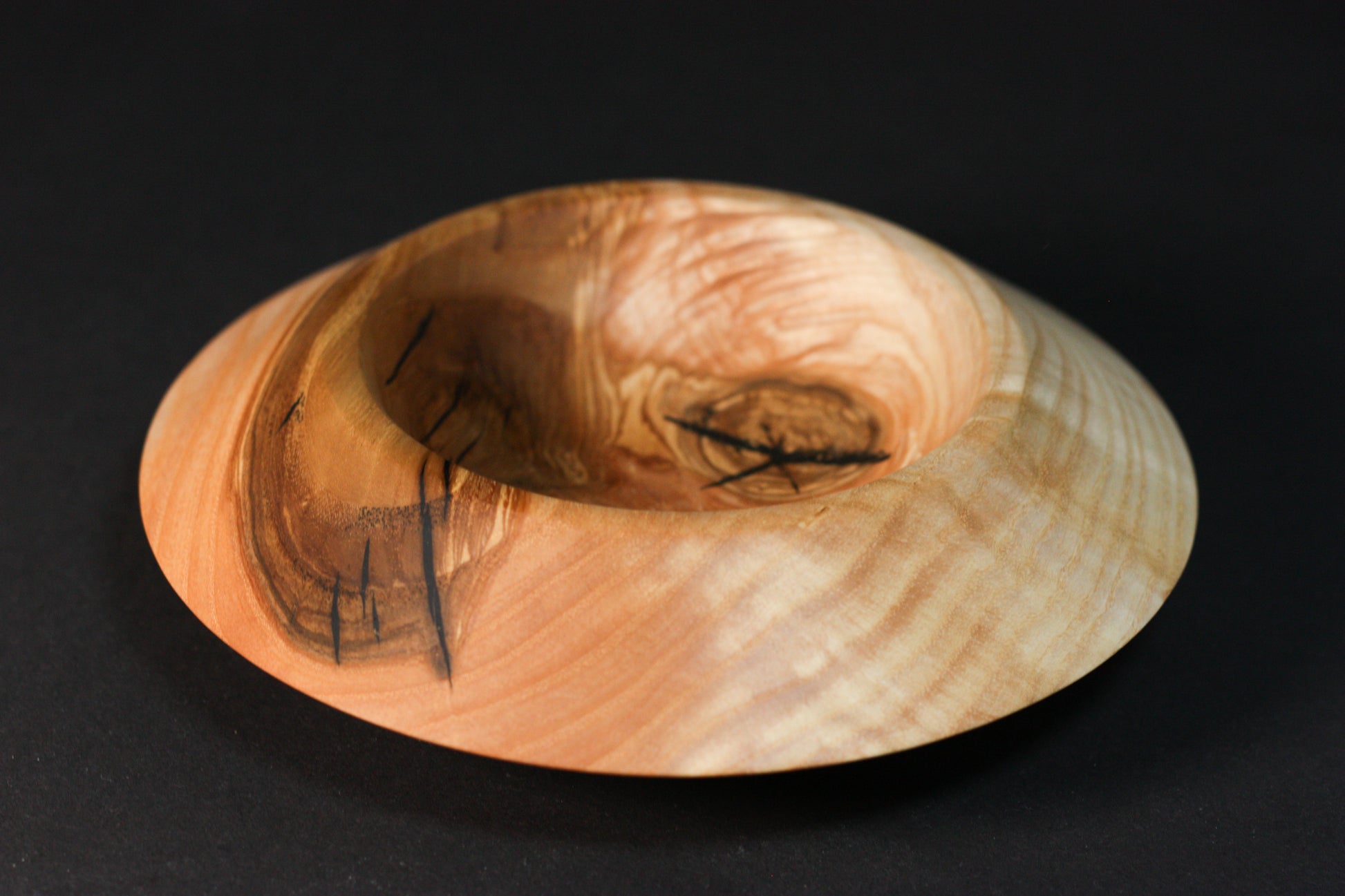 Handgefertigte Schale aus massivem Kernoliv-Eschenholz mit charakteristischer Maserung. Die beim Trocknungsprozess entstandenen Risse in der Schale sowie am Boden wurden sorgfältig mit schwarzem Epoxidharz gefüllt, wodurch jedes Stück einen modernen und einzigartigen Akzent erhält. Die Oberfläche ist mit lebensmittelgerechtem Tungöl veredelt.